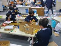 図工室からトントンと音が聞こえてきます。覗いてみると3年生が金づちと釘を使って、「コロリンゲーム」を作っていました。好きな絵を描き、絵の具で着色した板に釘を打っていきます。その後に輪ゴムを掛けてコースを作っていきます。楽しいゲームができそうですね。