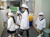 1年生が運ぶのを手伝ってくれたりエプロンのたたみ方を教えてくれたりおかずをつぎ分けてくれたり、6年生の姿に1年生の顔にもだんだんと笑顔が広がっていきました。